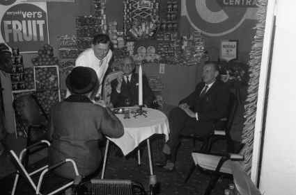 Negatief, 00-03-1964, Foto Pierre van de Meulenhof, Kruidenier Jan van Gameren serveert aan bezoekers. Origineel negatief aanwezig in archief v.d. Meulenhof