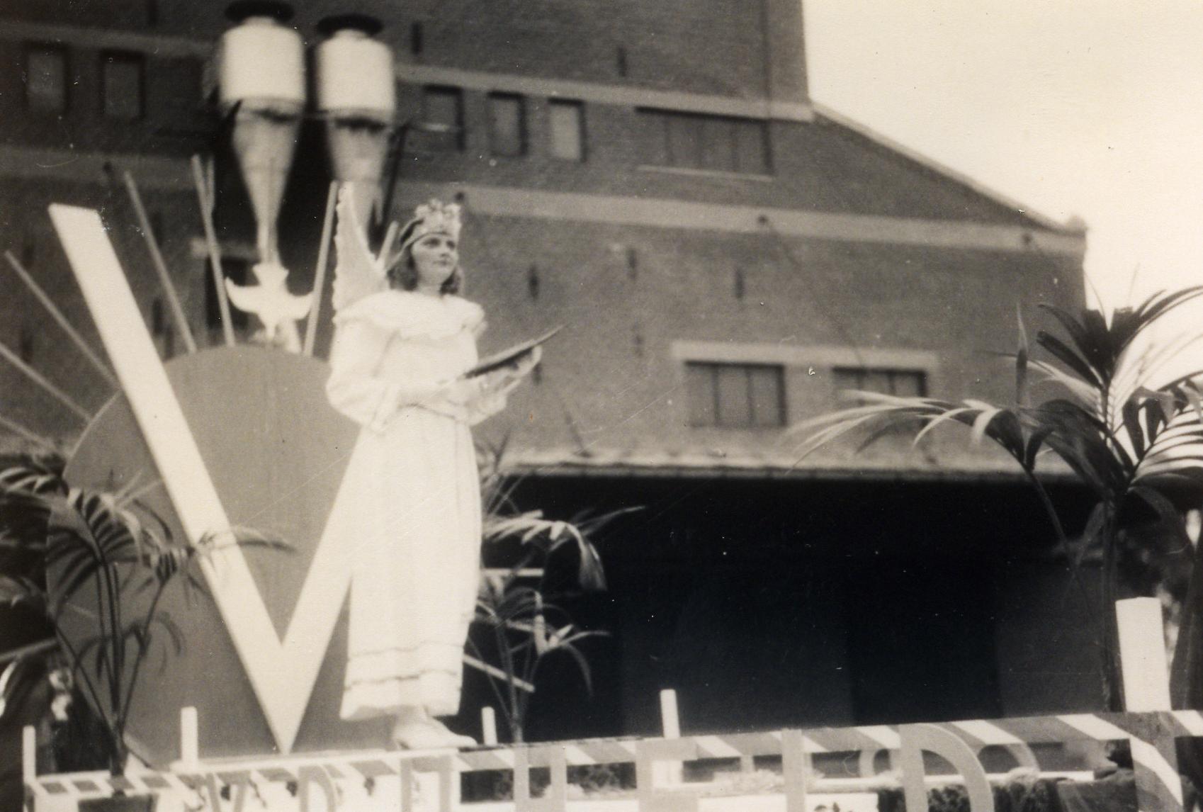 origineel, 1945, Bevrijdingsoptocht, Praalwagen van de "Straat" voorstellende het Vrijheidsbeeld, Marna van Hoof?