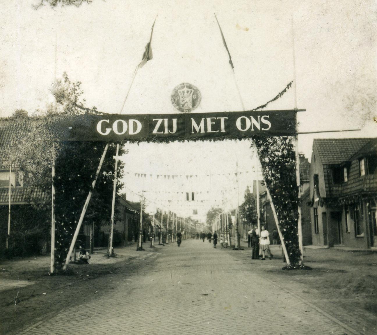 origineel, 25-09-1945, Bevrijdingsfeest, 4: Foto: Straatversiering tijdens het bevrijdingsfeest op 22 september 1945, ter gelegenheid van het eenjarig bevrijdingsfeest. Ereboog aan de Dorpstraat tegenover het huis van secretaris Michael van Roij.. Op de achtergrond de Dorpstraat met vlaggetjes