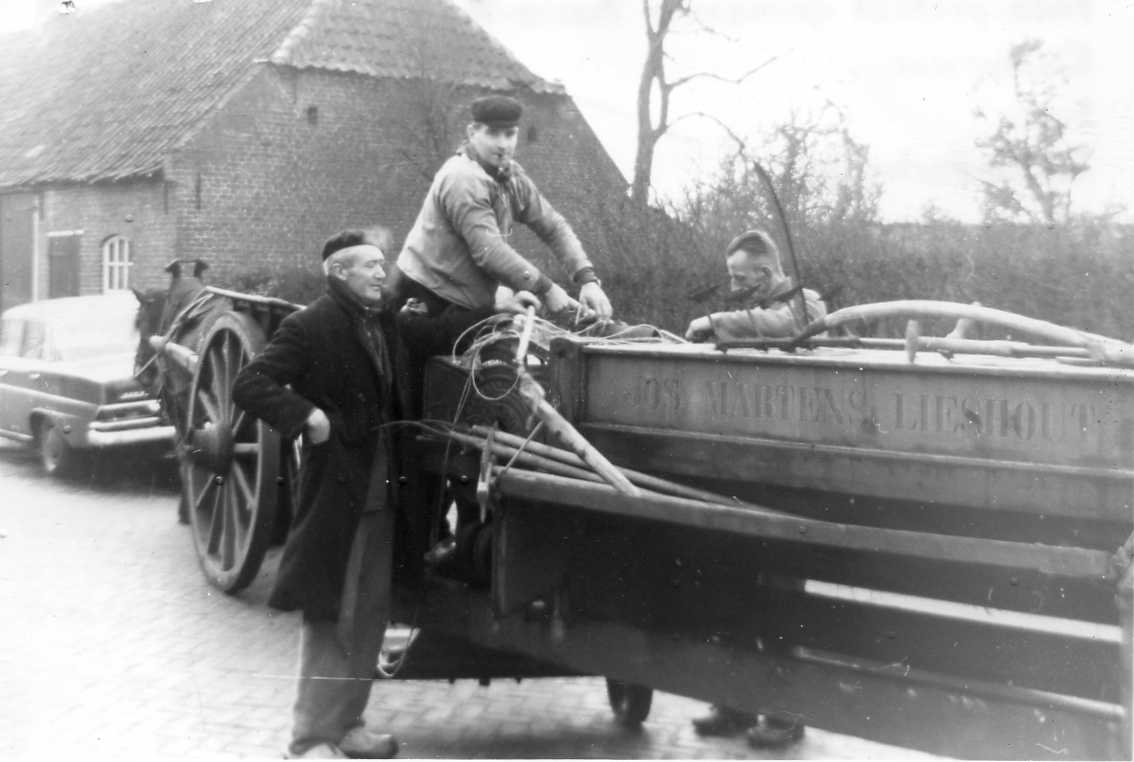 repro 07-02-1969 Boerenverhuizing Verhuizing kinderen Roijakkers van pand Kerkstraat 41 naar Pater Eustachiuslaan 1A. Op achtergrond boerderij Kerkstraat 41. staand op de wagen Cor v.d.Berk. Voor de wagen staand Frans Raijmakers. Achter de wagen dhr. Aarden