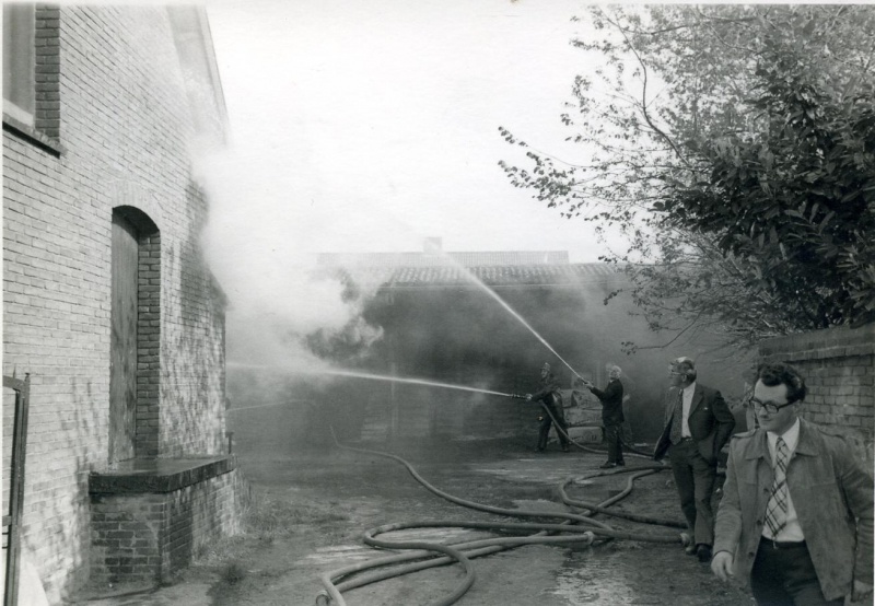 Brand in het oude pand van de Boerenbond a/d Dorpsstraat, rechts Jan Heesakkers (uit Mariahout), zaakvoerder, daarachter K.Bieman en Henk.van Roij