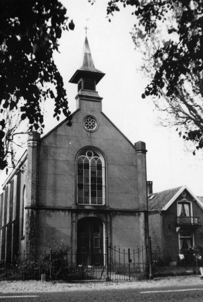 omschrijving: voorzijde Ned. Hervormde kerk, Kouwenberg 29, rechts op nr. 31 de kosterswoning (villa Reposa)