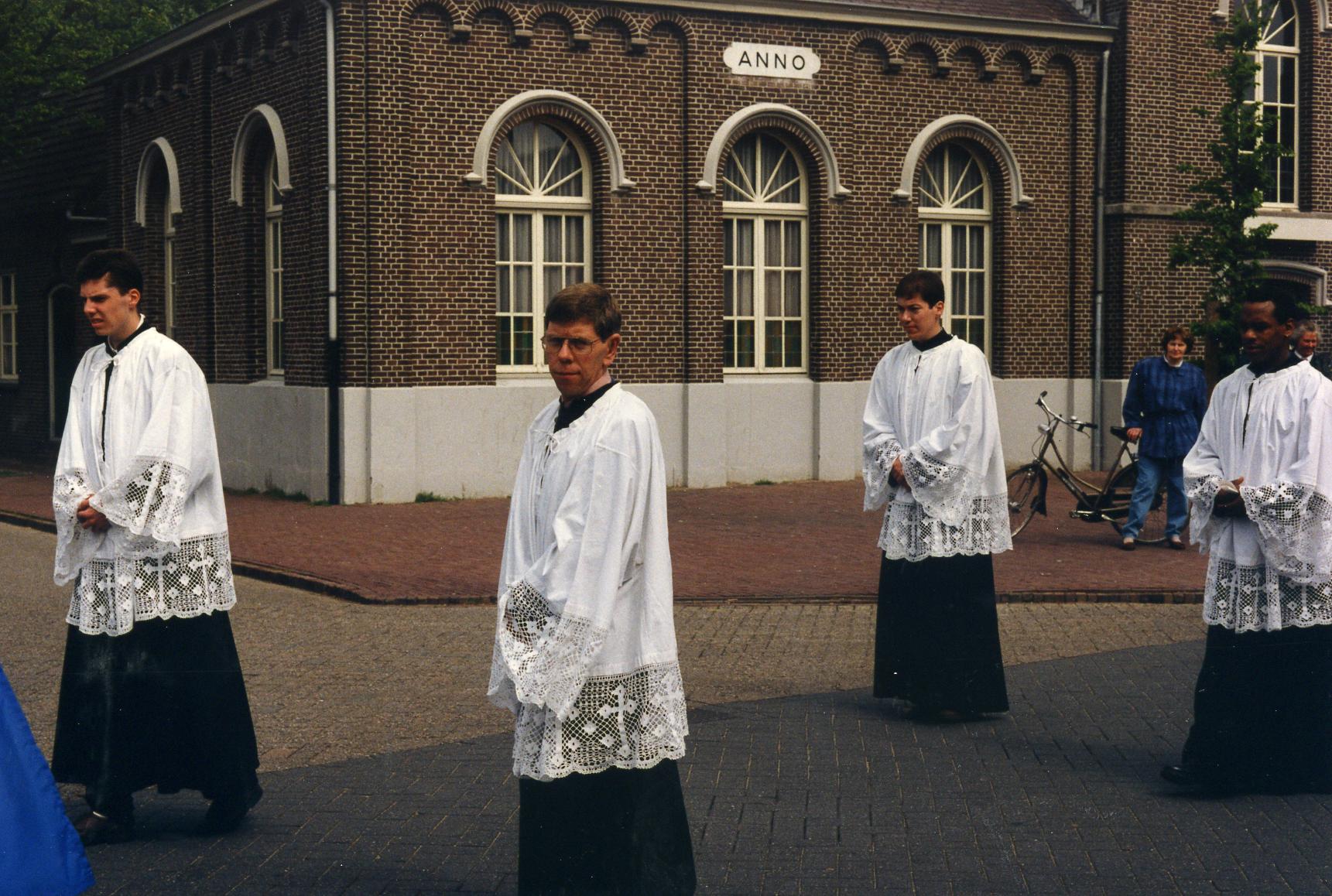 Omschrijving: Misdienaars vooraan in de stoet, op de voorgrond Ruud Kweens.