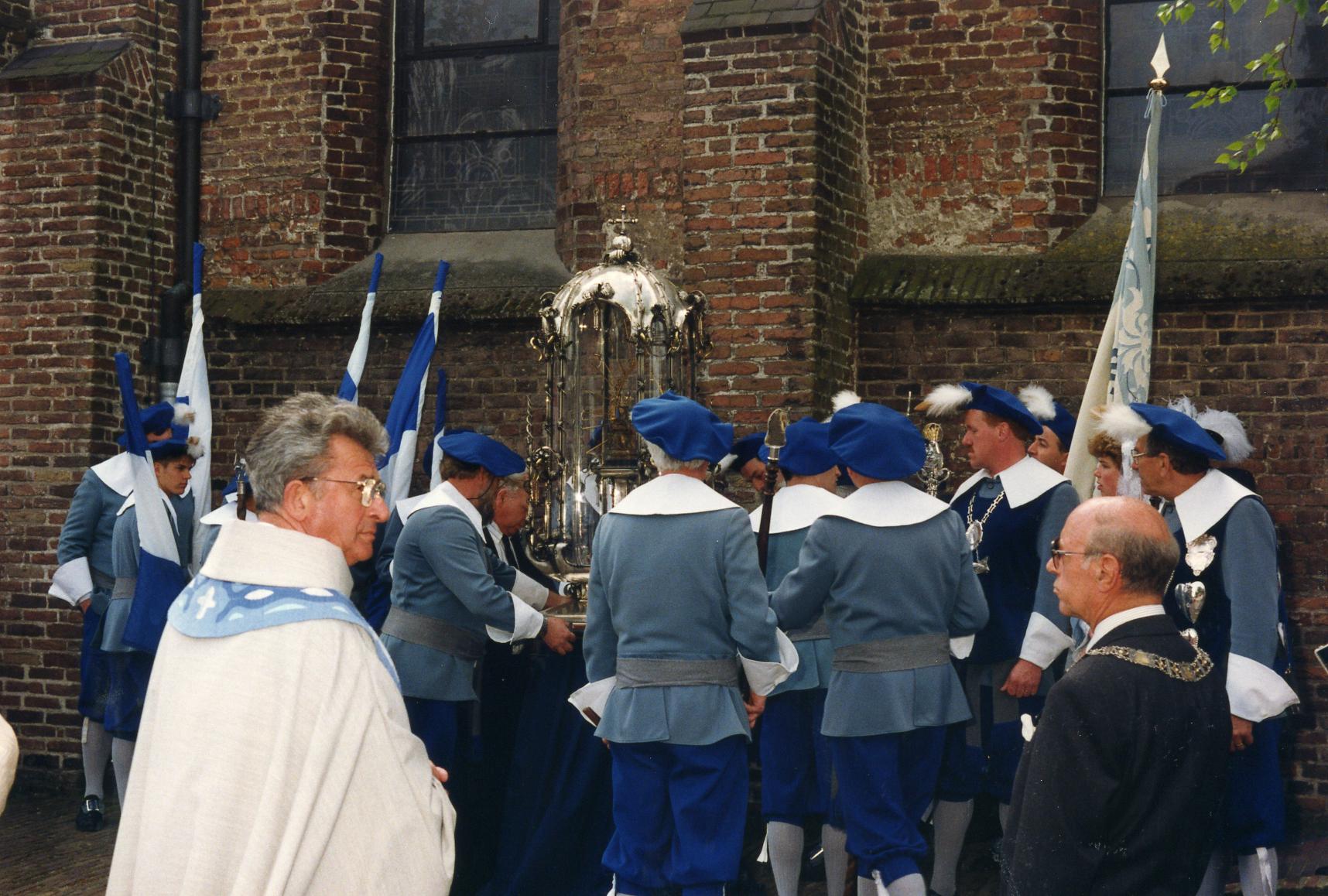 Omschrijving: Bij de Onze Lieve Vrouwe kapel wordt de schrijn met het beeld van Onze Lieve Vrouw opgesteld door de gildebroeders van het Onze Lieve Vrouwegilde. Links Pastoor Tilman, rechts burgemeester Buijs.