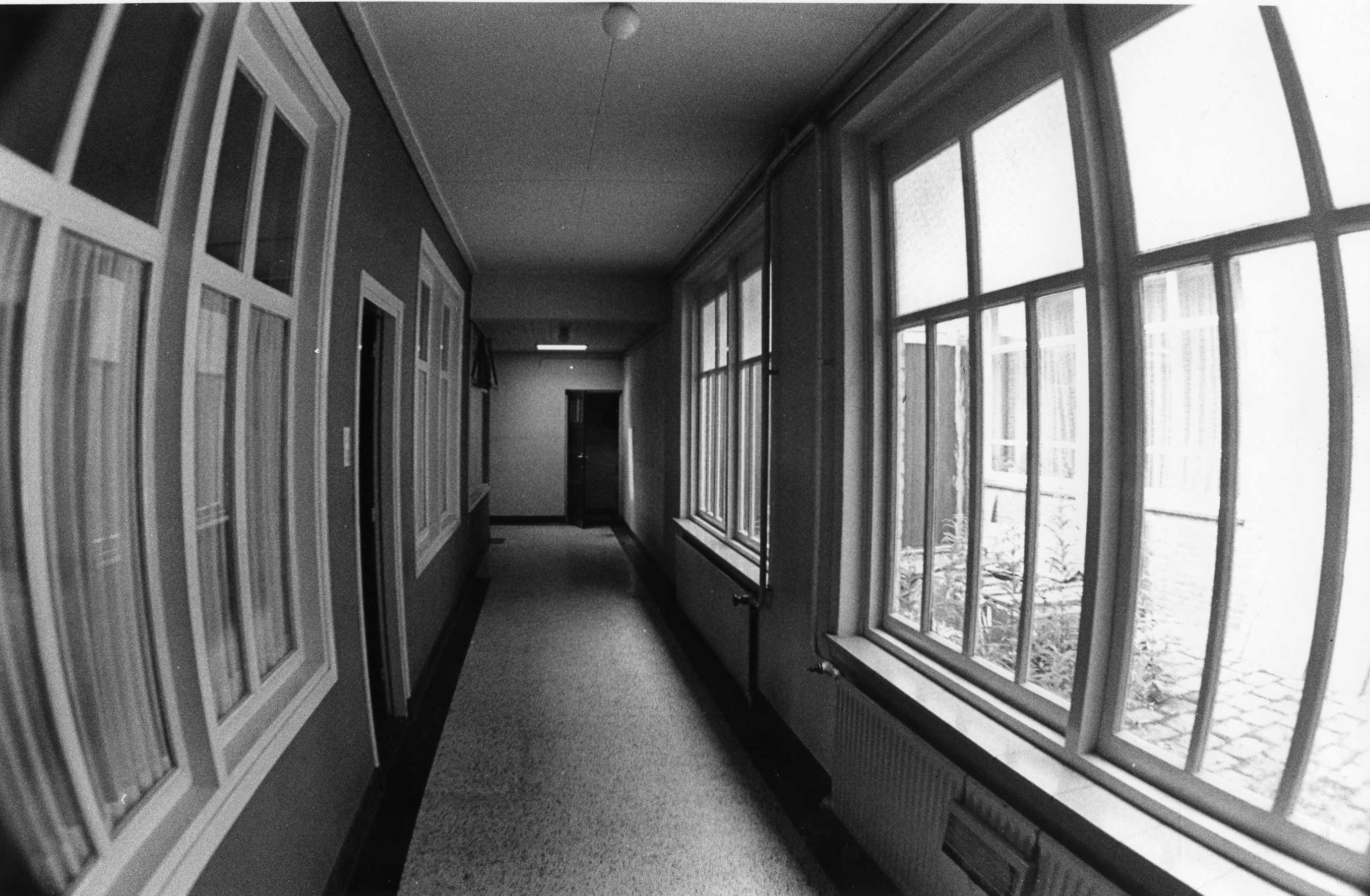 Omschrijving; Doorloopgang naar de gymzaal, pianokamertjes, 1e verdieping fysicalokaal en coupeuse-opleiding.