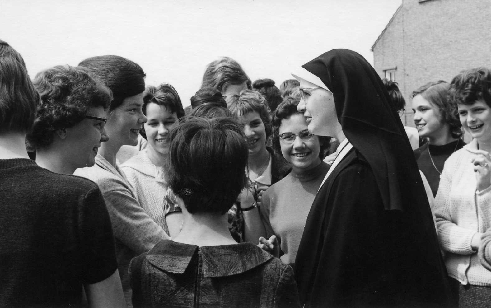 Mariëngaarde. Omschrijving; Nieuwe kapel, inwijding. Na afloop zusters samen met een aantal pensionairen.