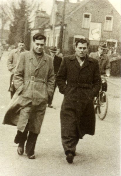 Omschrijving: Toon en Marinus van Lierop op de Kouwenberg, op weg naar de Hoogmis.