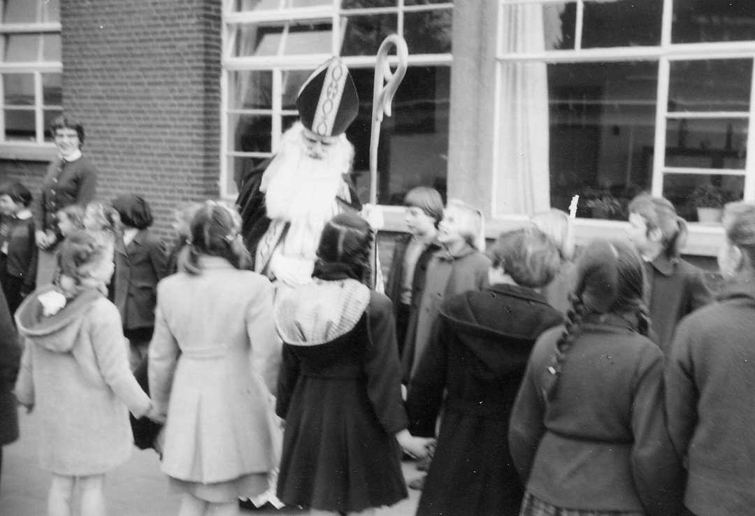 Mariaschool, Sint Nicolaas op bezoek. Juffrouw Riek Nooijen kijkt lachend toe.
