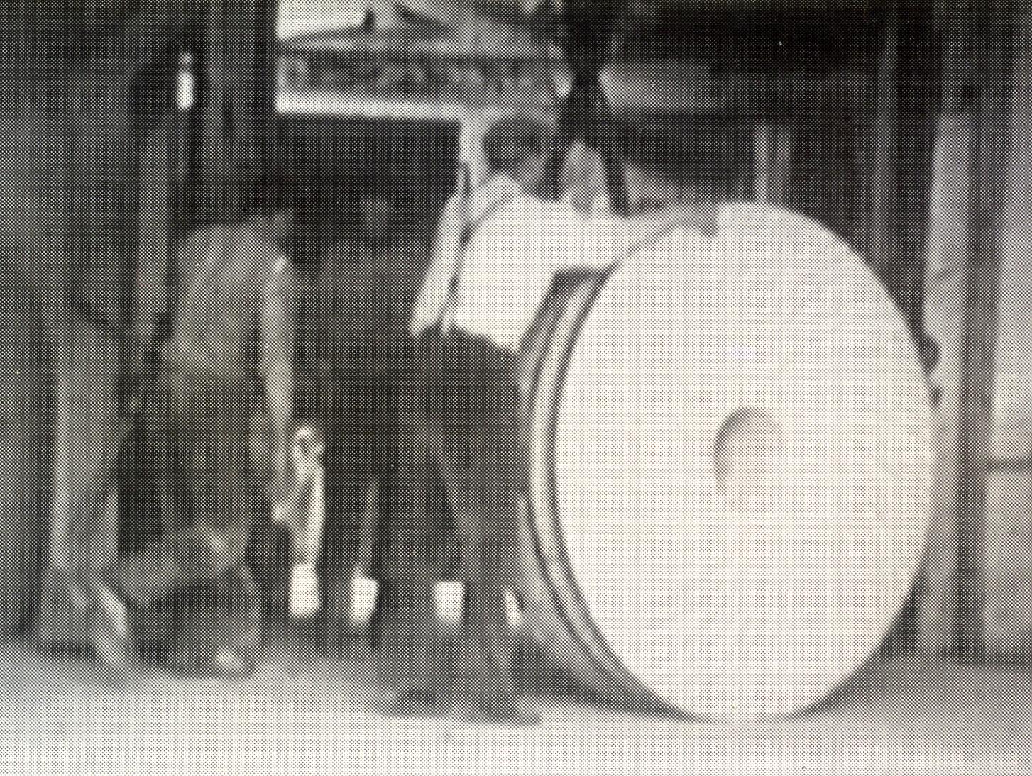 Molensteenfabriek N.V. Gebr. Jaspers en zonen Heren in de molensteenfabriek met een molensteen.