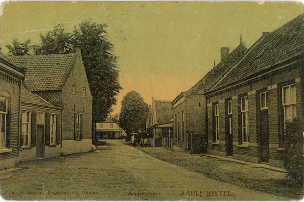 omschrijving; Kapelstraat gezien in de richting Kouwenberg met in de verte café Heesius (later bakker en kruidenier Hannes Verhoeven).- Rechts zien we nog de veranda van café van Hemert later van Duppen, Wigmans en de Stal aan de Kouwenberg.
