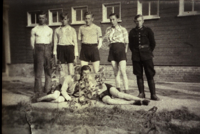 repro, 00-00-1944, arbeidsdienst, Wim Wich bij de sportploeg. Hij heeft een insigne ontvangen voor zwemmen, 100 meter hardlopen, werpen met voetbal, hoogspringen, verspringen, touwklimmen, veldlopen en een afstandsmars.
