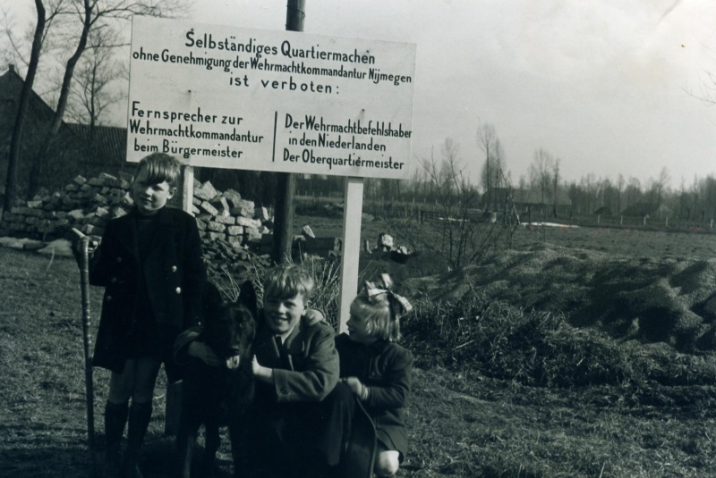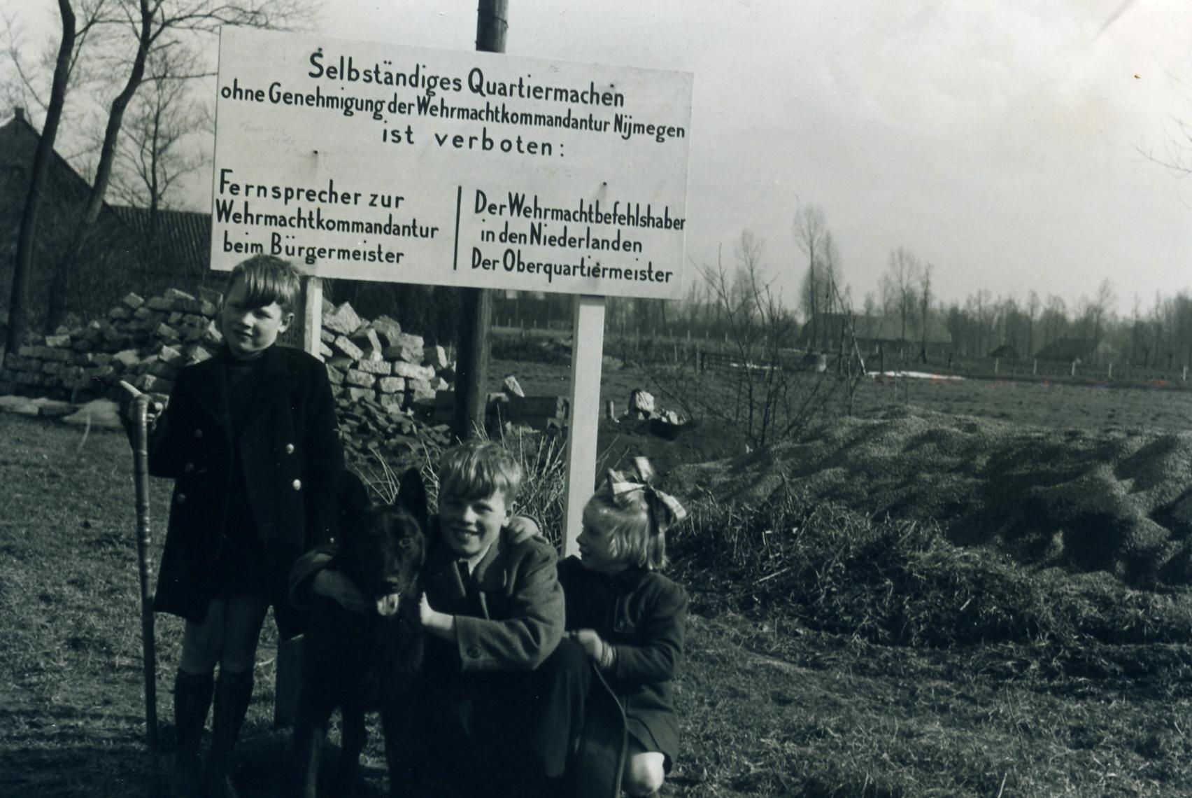 Tweede wereld oorlog, Verbodsbord. Hoek Kerkstraat Opstal. v.l.n.r.: Noud Prinsen, hond, Karel en Joke Prinsen. (1940-1945)