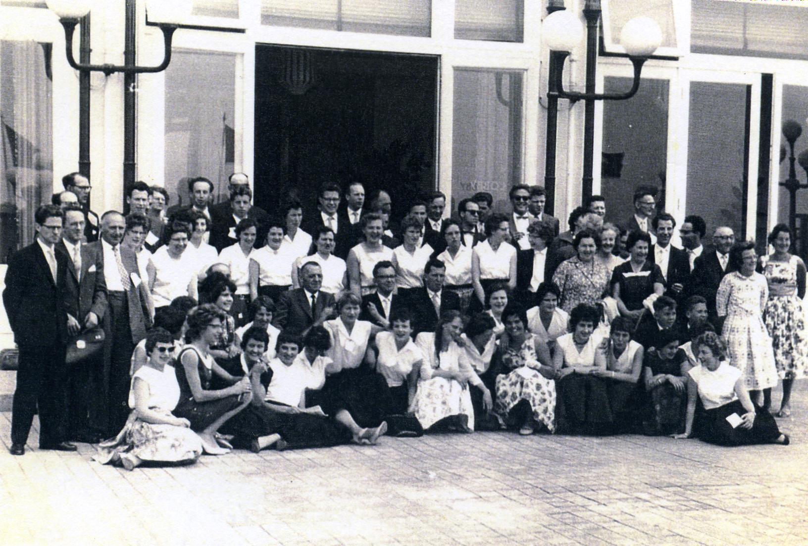 Staand v.l.n.r.: Jan van Roij, Sjaak Houët, Marinus Smits, Mieke Gijsbers, Joke Smits, vd Voort, Toos Houët, Corrie van de Elsen, Kitty Vos, Jo Hagelaar, Lenie Houët, 12?, Riek Gijsbers, 14 Marieke de Bont-Houët, Beb Verhallen, Goen van Hoof, Gerard Barten, Rienie van Gameren, Jan van Roij, Lea van Gerwen.