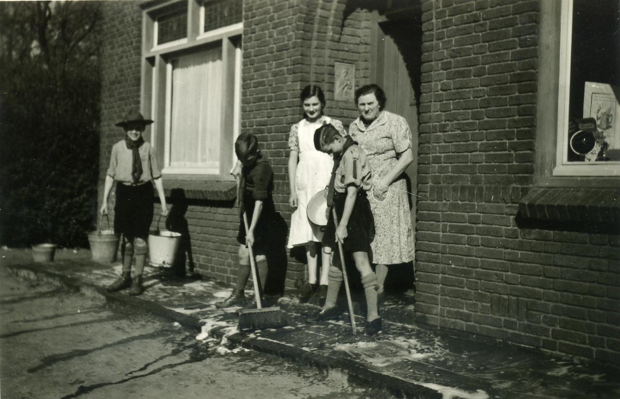 Verkenners; Heitje voor karweitje met in de deur Greet Senders en Martha Slaats.