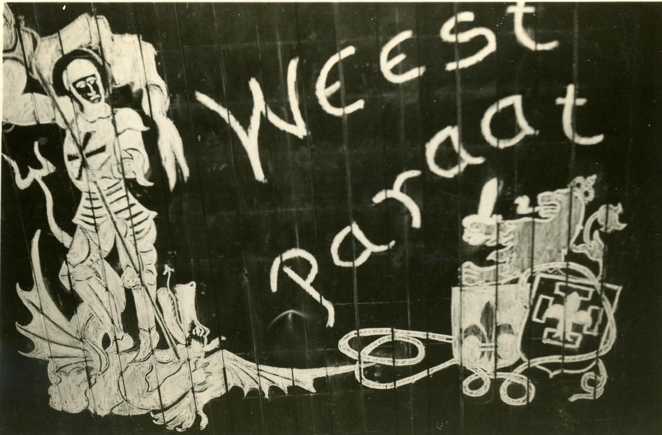 Verkenners; Interieur blokhut, muurschildering "Weest Paraat"; St. Joris die de draak verslaat.