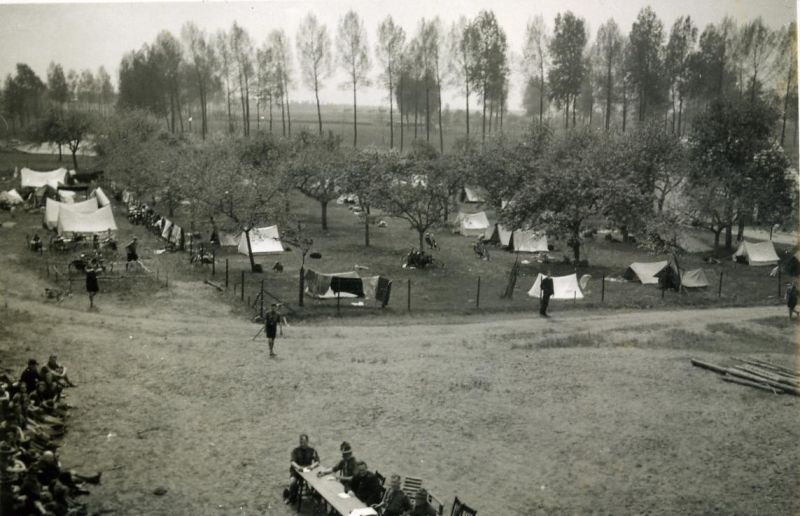 Overzichtsfoto van een groot kamp in een boomgaard.
