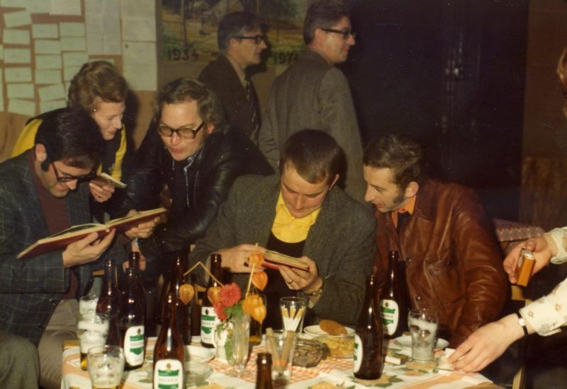 Fotoalbums bestuderen, vlnr. Wim Beeren, ?, Mattie Swinkels, Jan van Ganzenwinkel en Hans van Roij. Twee pers. op de achtergrond zijn onbekend.