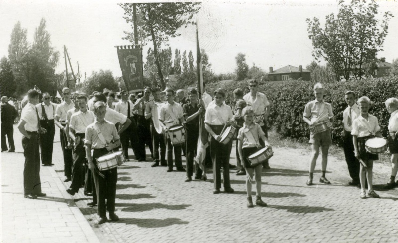 Omschrijving; Harmonie De Goede Hoop tijdens de Mariaomgang, 1953 of 1954. De harmonie stelt zich op, op de Bosscheweg bij Mariëngaarde.