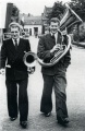Omschrijving; v.l.n.r. Harrie van Vijfeijken en Nol Driessen op weg naar de repetitie van de harmonie.